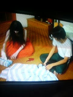 写真は女幽霊アサミさんが自分の口から垂れた血をティッシュで必死に拭いてるシーンです