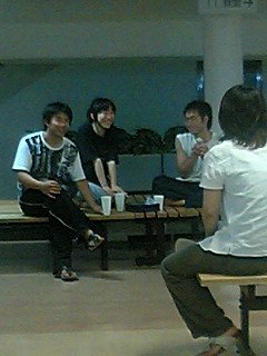 | レストラン氏には、お酒を飲んでべろんべろんになるシーンがあるので、みんなでせっせと酒を勧めてみました。 ころあいを見てセリフの掛け合いをしてもらったところ・・・・・・・・・・・全然ダメでした。 「俺には何の力も無い」(笑) 「しっかりしろ、正章」(笑) |